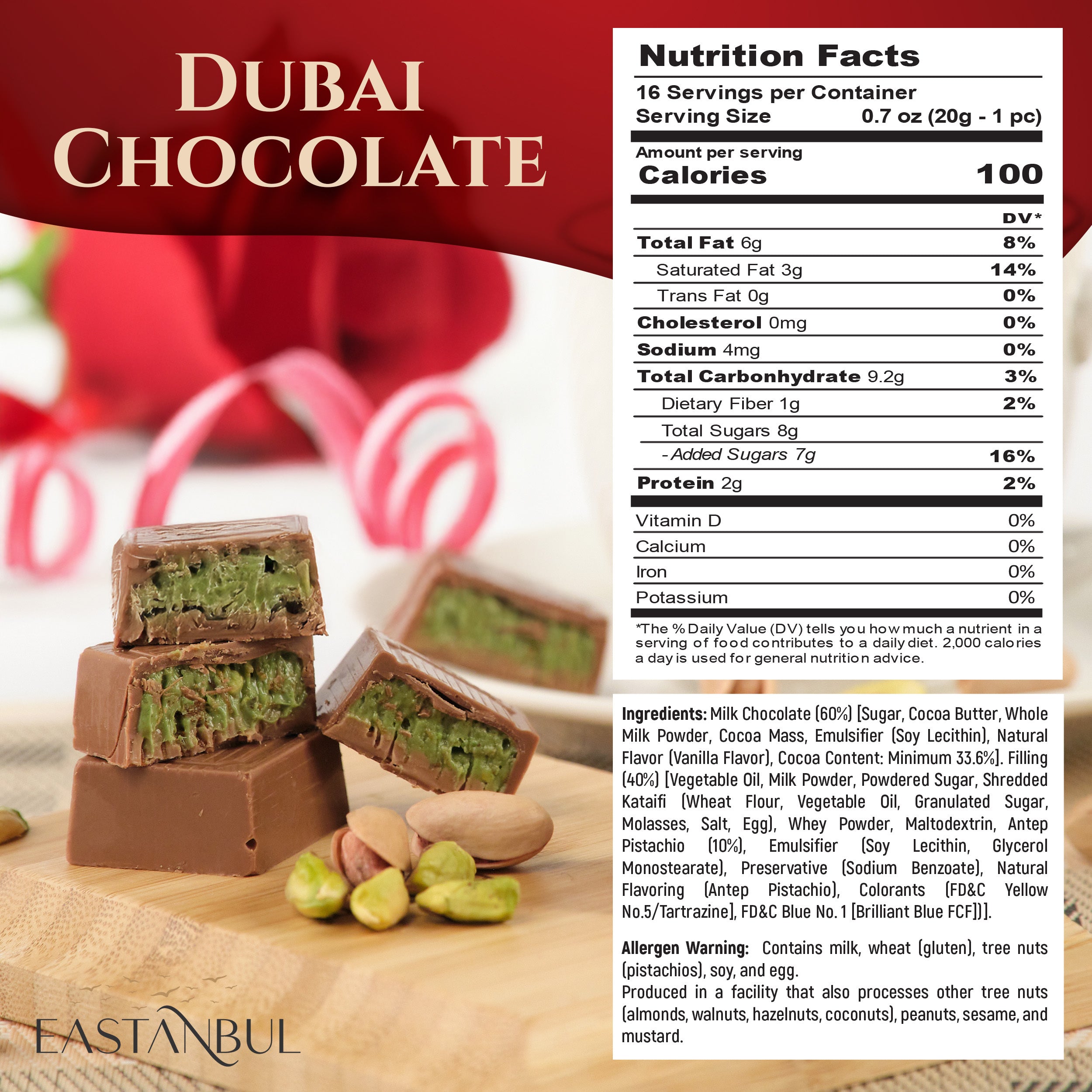 | Ingredients | Milk Chocolate (60%) [Sugar, Cocoa Butter, Full Fat Milk Powder, Cocoa Mass, Emulsifier (Soy Lecithin), Flavoring (Natural Vanilla), Cocoa solids minimum 33.6%)], Filling (40%) [Vegetable oil, milk powder, powdered sugar, shredded kadayıf (wheat flour, vegetable oil, granulated sugar, molasses, salt, egg), whey powder, maltodextrin, Antep pistachio (10%), emulsifier (soy lecithin, glycerol monostearate), preservative (sodium benzoate), flavoring (Antep pistachio aroma), colorants (E102, E133)]. |