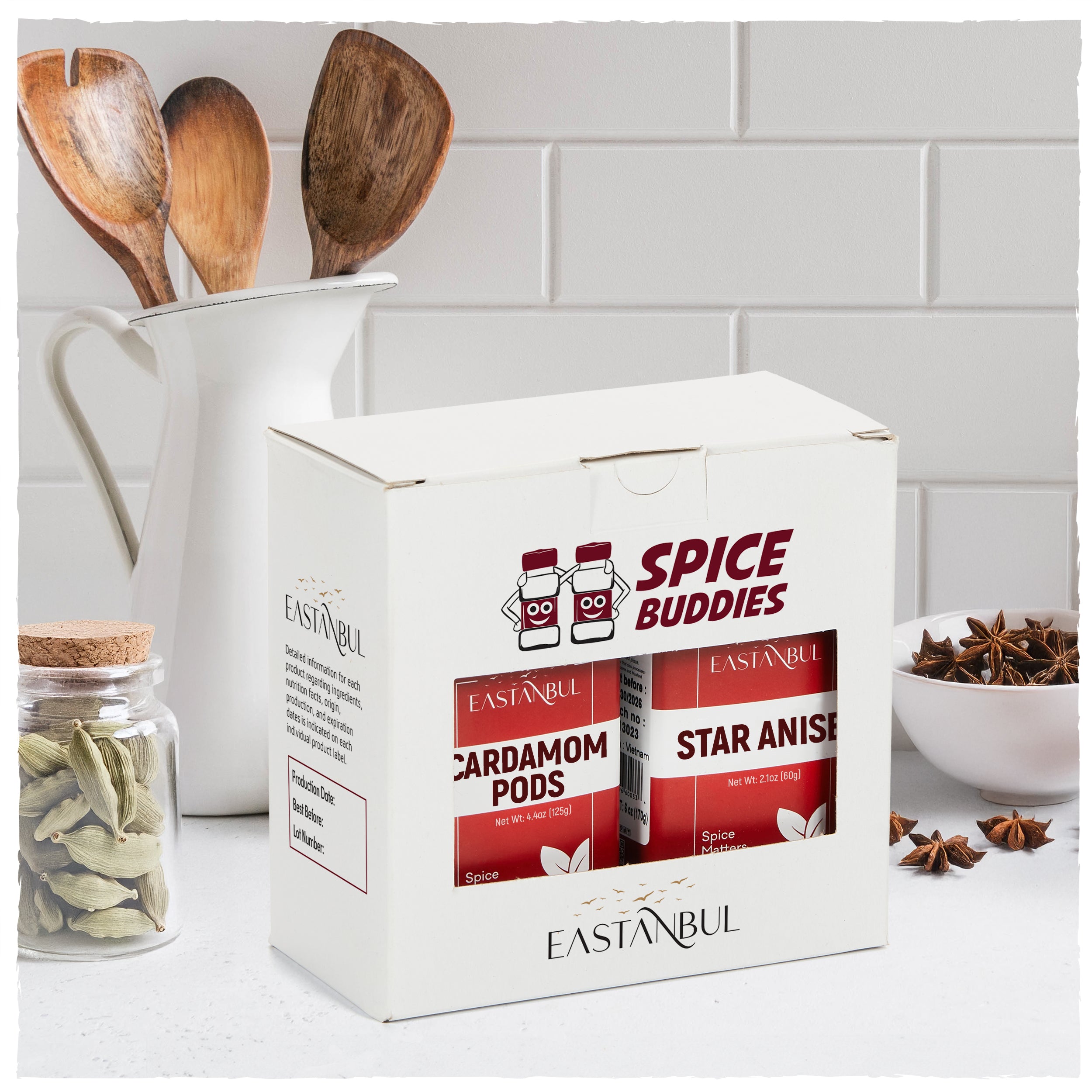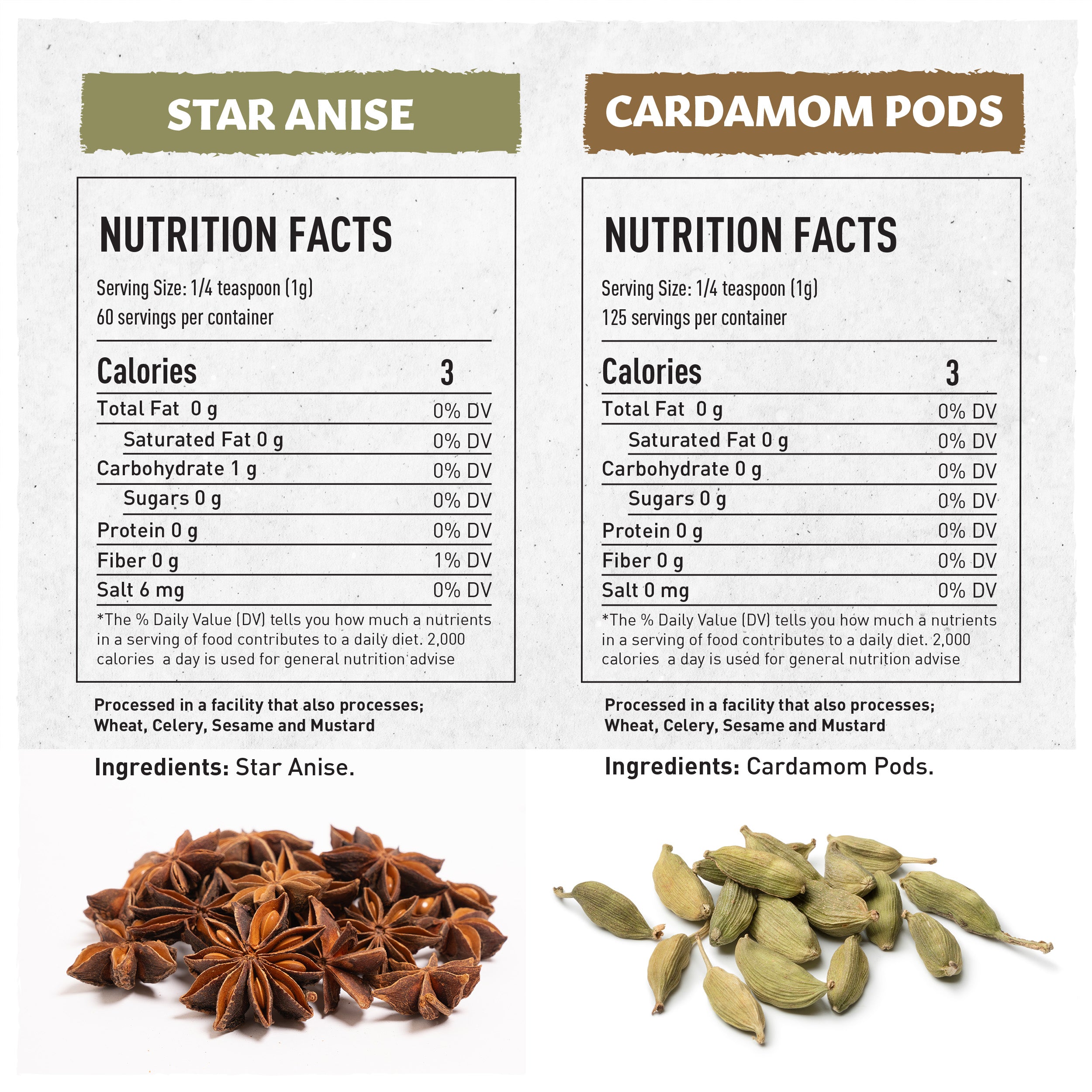100% Natural & Clean : Crafted for purity and freshness — vegan, non-GMO, gluten-free, and non-irradiated. This 2-piece spice set of cardamom pods and whole star anise contains no MSG, additives, or artificial colors. Each spice is packed in a moisture-barrier, resealable bag to ensure long-lasting freshness, aroma intensity, and flavor quality