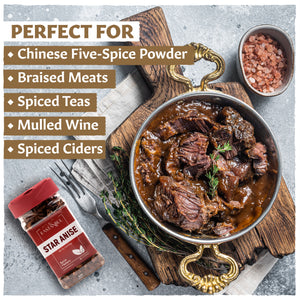 Aromatic Star Anise Whole : Our premium-grade whole star anise delivers a rich, licorice-like aroma and distinct sweetness that enhances soups, sauces, baked goods, teas, and warm beverages. Each star anise pod is hand-selected to preserve its natural shape and aromatic oils. Perfect for star anise tea, pho broth, syrups, or holiday recipes. This all-natural, non-GMO, and versatile spice originates from China and Vietnam and is packed in resealable packaging to protect freshness and prevent brea