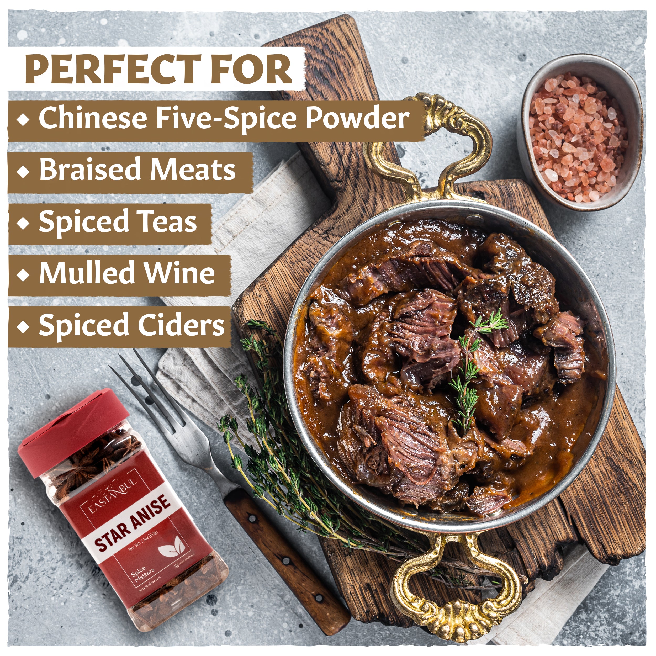 Uses: Widely used in Asian cuisine, particularly in broths, teas, and spice blends. Star anise whole is valued for its decorative shape and potent flavor.