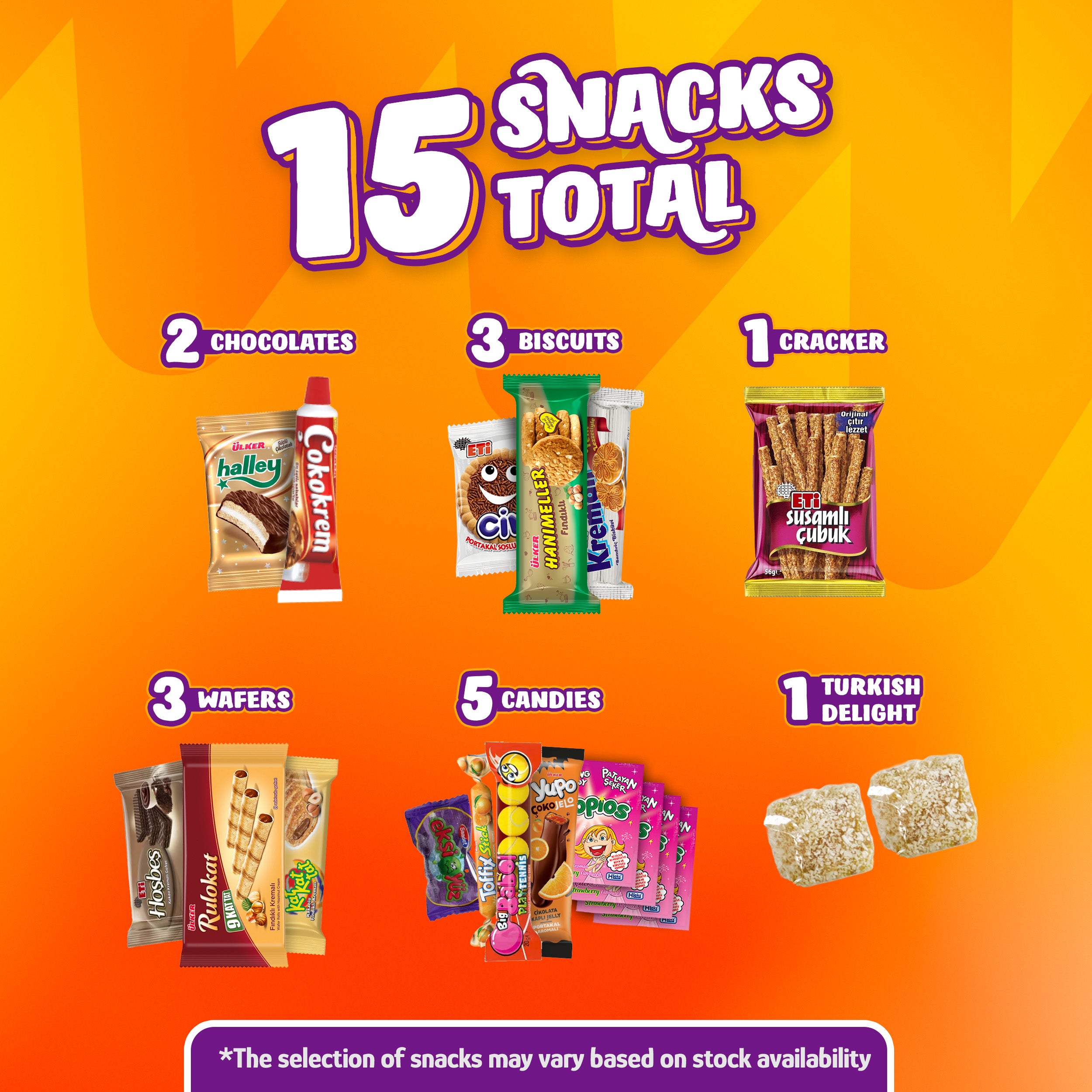 A Delightful Mix: Looking for snacks from around the world box? Curious about different country snack boxes? If yes, Then please give a try to our 15 pieces selection showcasing staple Sweet, Savory, Chewy, and Crunchy assortments from esteemed Turkish brands