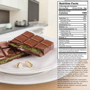 | Ingredients | Milk Chocolate (60%) [Sugar, Cocoa Butter, Full Fat Milk Powder, Cocoa Mass, Emulsifier (Soy Lecithin), Flavoring (Natural Vanilla), Cocoa solids minimum 33.6%], Filling (40%) [Roasted Kadaif (Wheat Flour (Gluten), Water, Salt, Sugar, Pistachio Paste (Antep Pistachio 70%), Vegetable Oil (Sunflower), Milk Powder, Skimmed Milk Powder, Whey Powder, Emulsifier (Soy-Sunflower Lecithin), Flavoring (Vanillin, Milk), Preservative (E211)] |