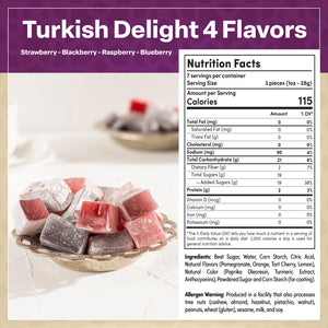 | Ingredients | Beet Sugar, Water, Corn Starch, Citric Acid (E330), Natural Aroma (Strawberry, Raspberry, Blackberry, Blueberry), Natural Food Colorings (Paprika E160c, Delphinidin E163b), Sugar Powder For Coating |