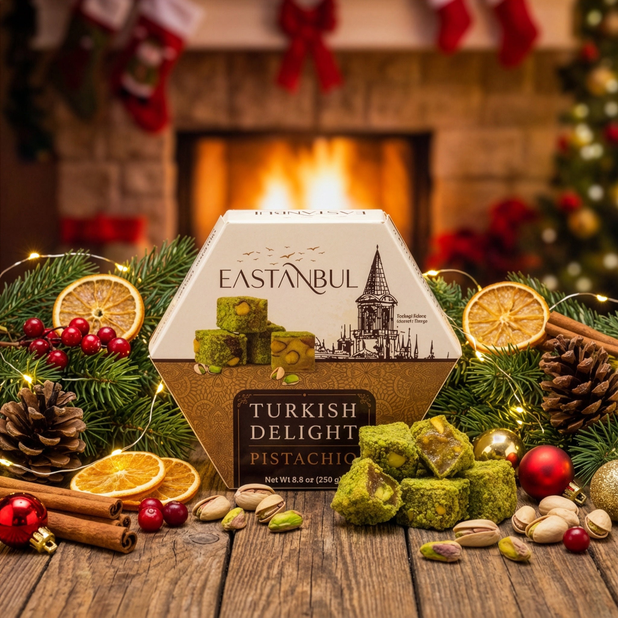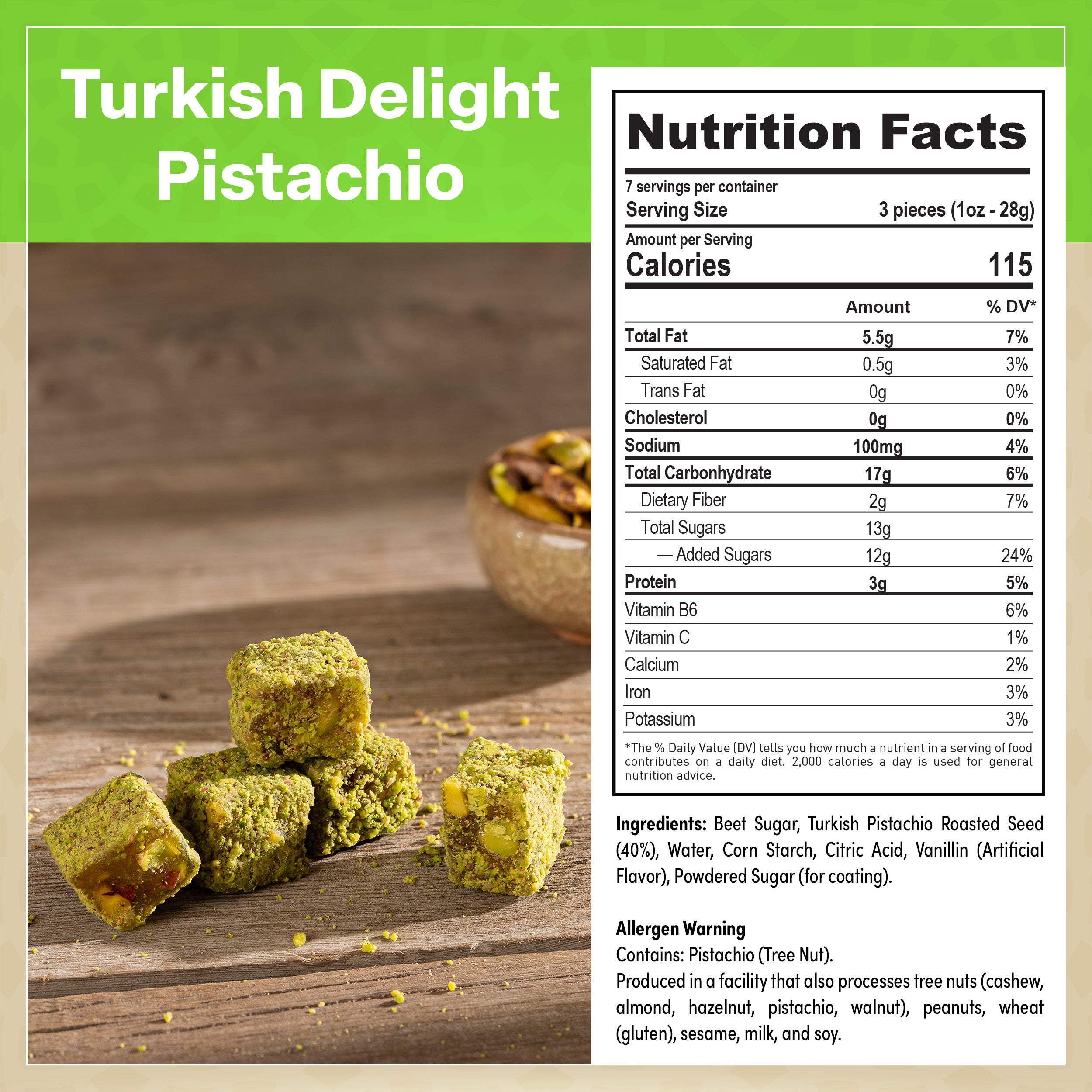 - Turkish Delights filled with double-roasted generously infused 20% Turkish pistachios