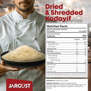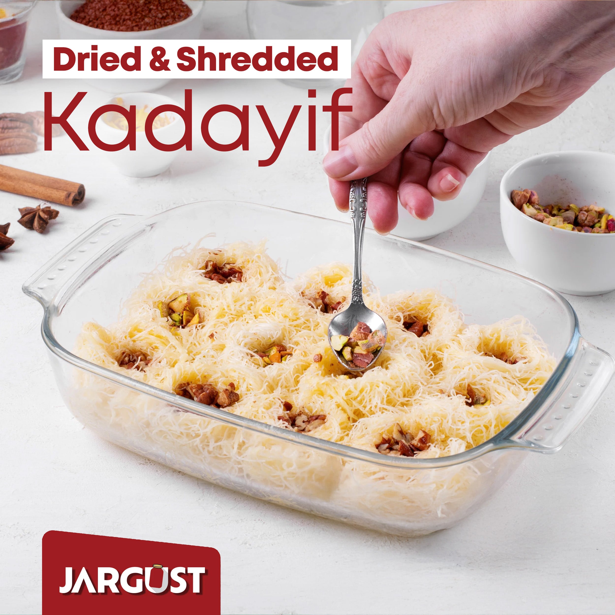 Ingredients: 100% shredded phyllo dough, carefully dried to preserve its texture and flavor for easy storage and use.