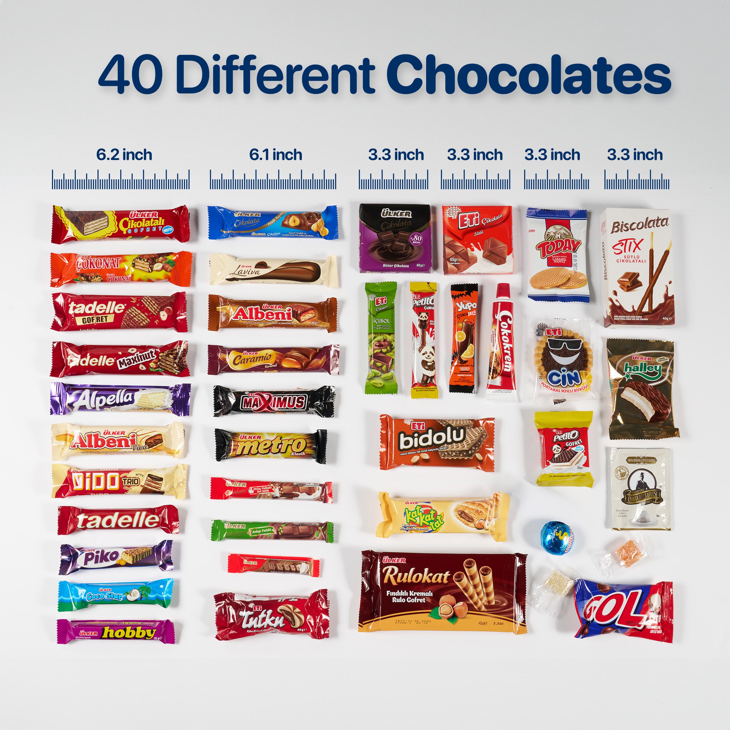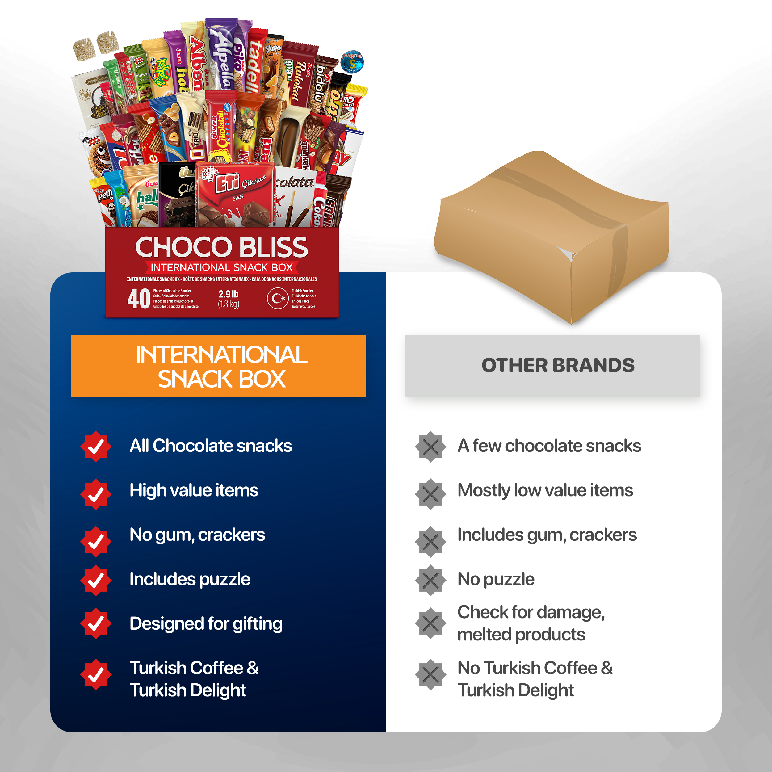 CHOCO BLISS VARIETY SNACK BOXES : Looking for a premium snack box or snacks variety pack for adults and kids that truly stands out? This 40-count international snack box features Turkish snacks and chocolates from around the world — from creamy wafers and nutty bars to fruity, caramel treats. Enjoy snacks for adults and snacks for kids in one gourmet selection, offering an authentic foreign snack box experience filled with the best snacks from around the world