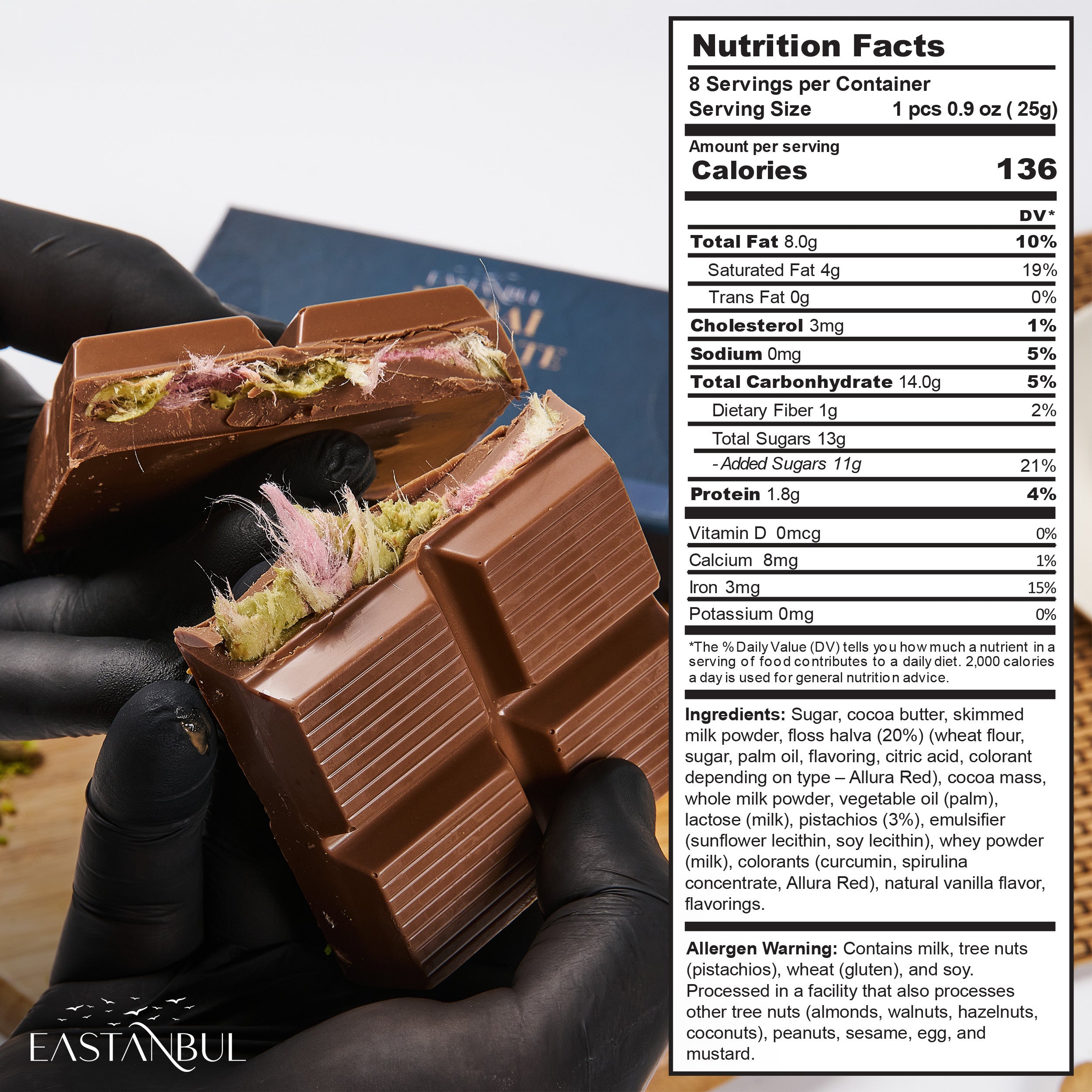 Indulge in the ultimate fusion of luxury and tradition with the Eastanbul Angel Hair Dubai Chocolate Bar. This handcrafted 7oz bar brings together premium Belgian chocolate, velvety Turkish pistachio cream, and a surprising heart of traditional Turkish cotton candy (pişmaniye). Inspired by the indulgent desserts of Dubai, this chocolate bar offers a truly unique texture and flavor experience.