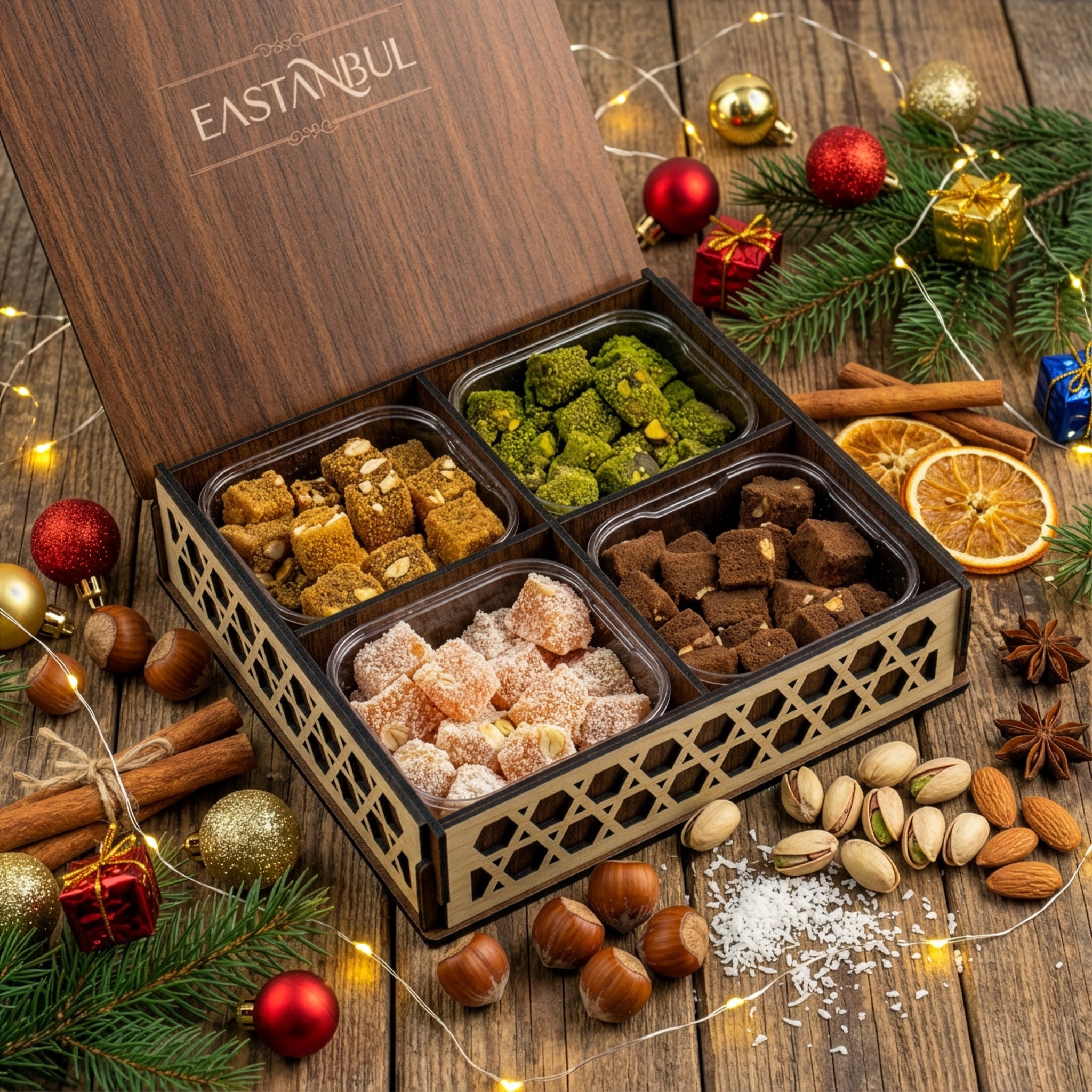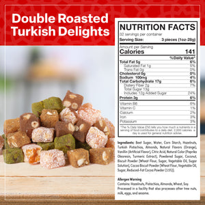 DOUBLE ROASTED TURKISH DELIGHT: This exquisite collection features four delightful flavors, each crafted with care for a perfect balance of taste and texture. Enjoy the rich combination of Vanilla Hazelnut with Cocoa Biscuit, the zesty Orange Hazelnut with Coconut, the classic Vanilla Almond with Lotus Biscuit, and the luxurious Vanilla Pistachio with Pistachio Powder. Presented in an elegant wooden box, this assortment is ideal for gifting or personal indulgence